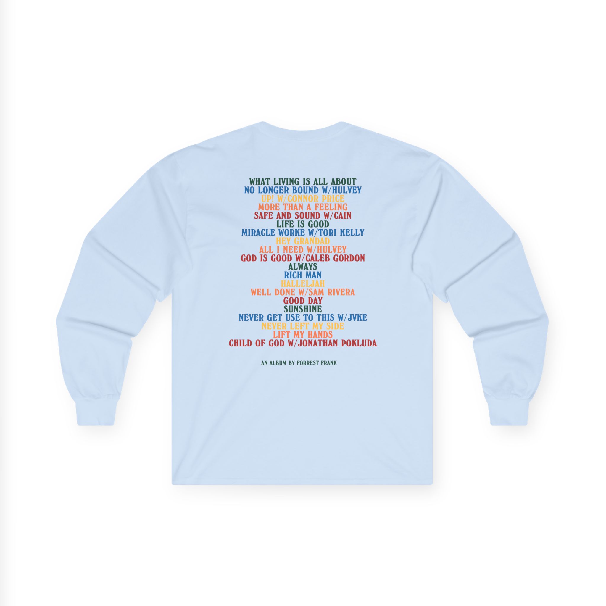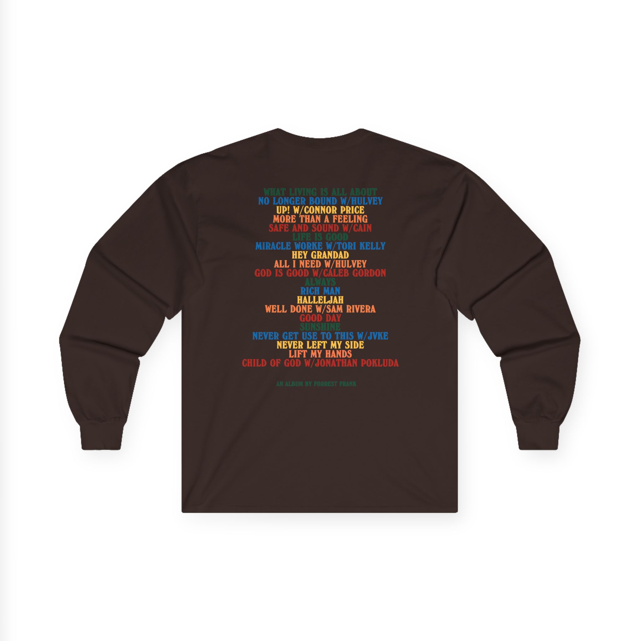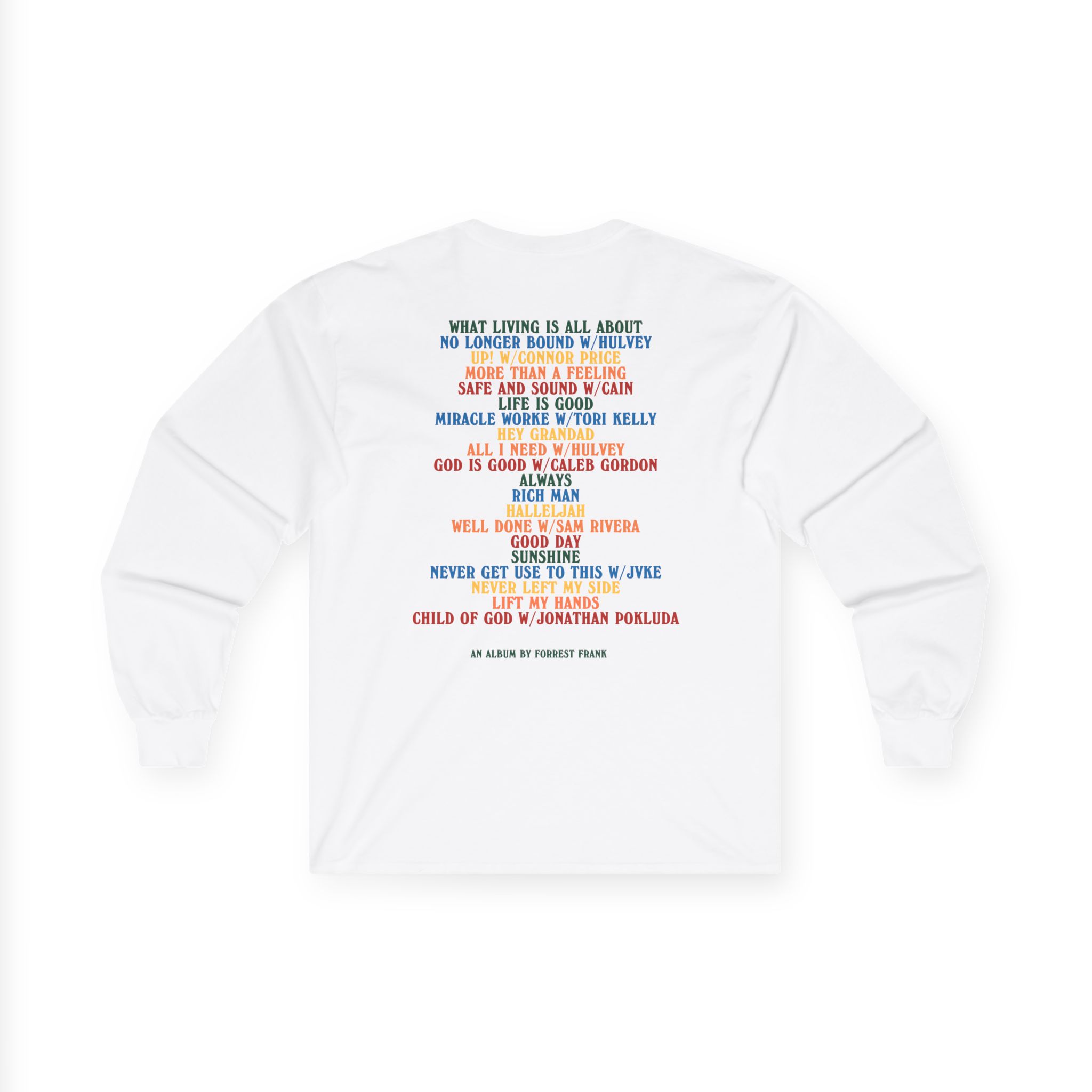 A bit more formal than a standard-issue t-shirt, the Forrest Frank Child of God Tracklist ultra cotton long sleeve tee is a clear comfort winner. The sleeves also act as a nice frame. There are no side seams. The shoulders are taped for improved durability. This makes for a good fitting around the shoulders and neck. The cotton used for these shirts is environmentally friendly.