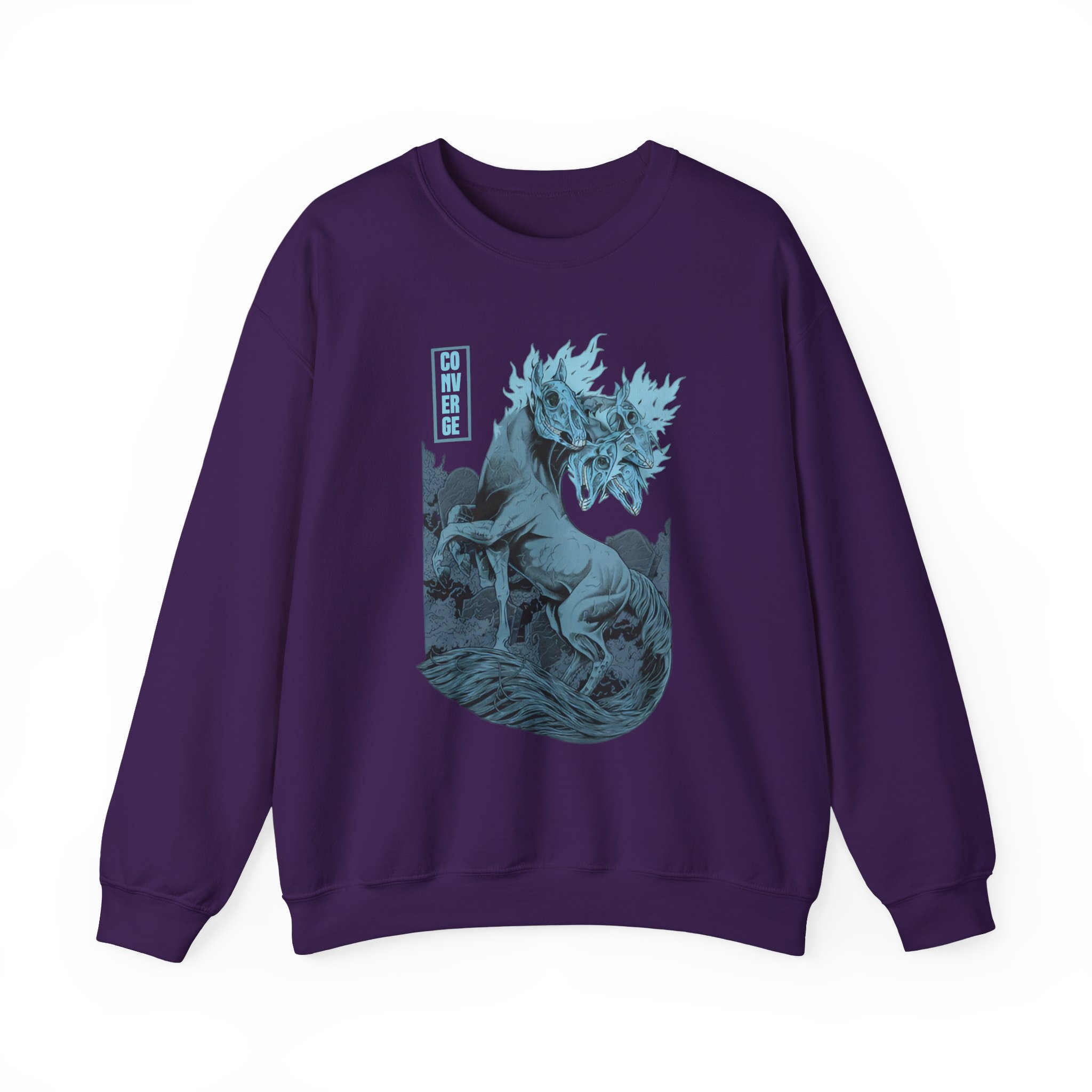 Ideal for any situation, a Converge Dark Horse unisex heavy blend crewneck sweatshirt is pure comfort. These garments are made from polyester and cotton. This combination helps designs come out looking fresh and beautiful. The collar is ribbed knit, so it retains its shape even after washing. There are no itchy side seams on these sweaters.