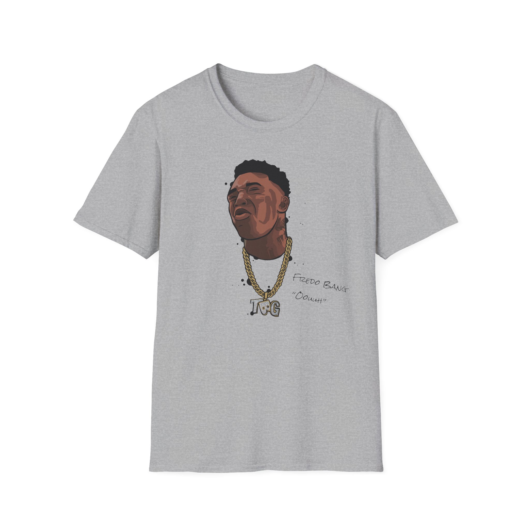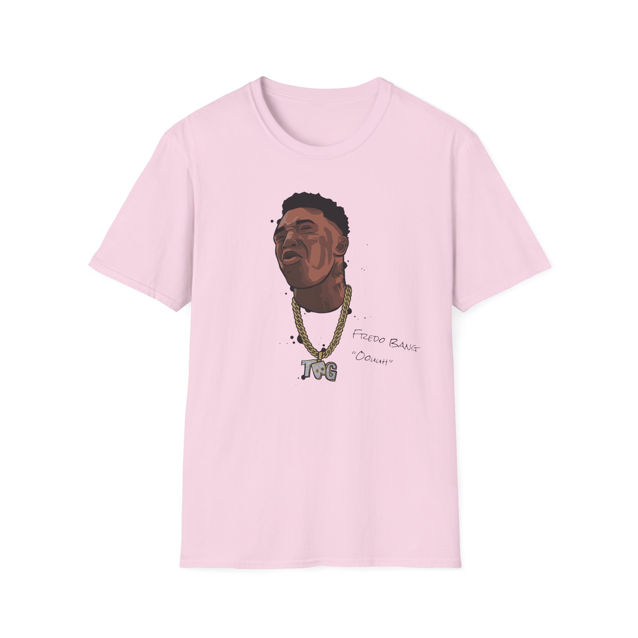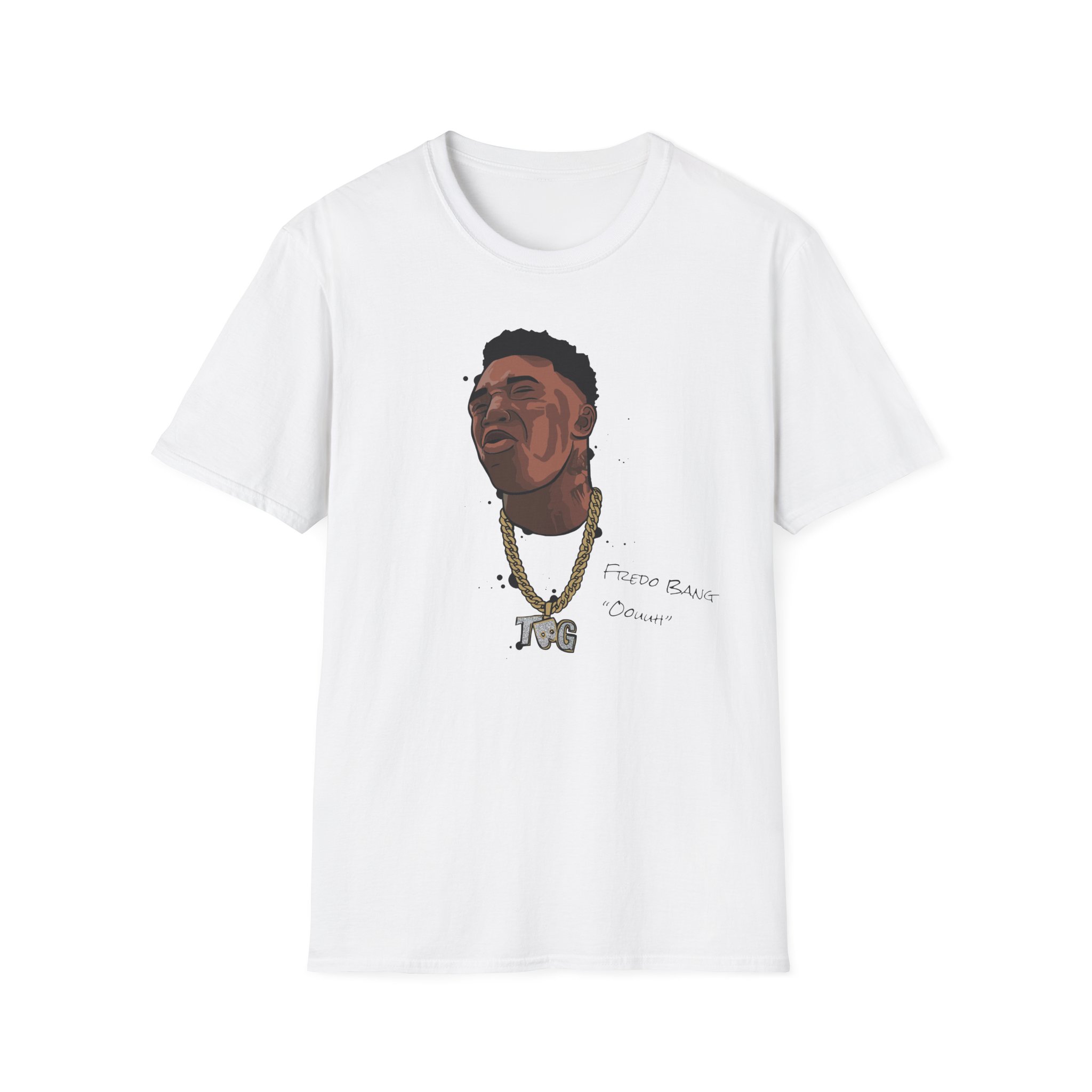 The Fredo Bang Oouuh unisex soft-style t-shirt puts a new spin on casual comfort. Made from very soft materials, this tee is 100% cotton for solid colors. Heather colors and sports grey include polyester. The shoulders have twill tape for improved durability. There are no side seams. The collar is made with ribbed knitting to prevent curling damage.