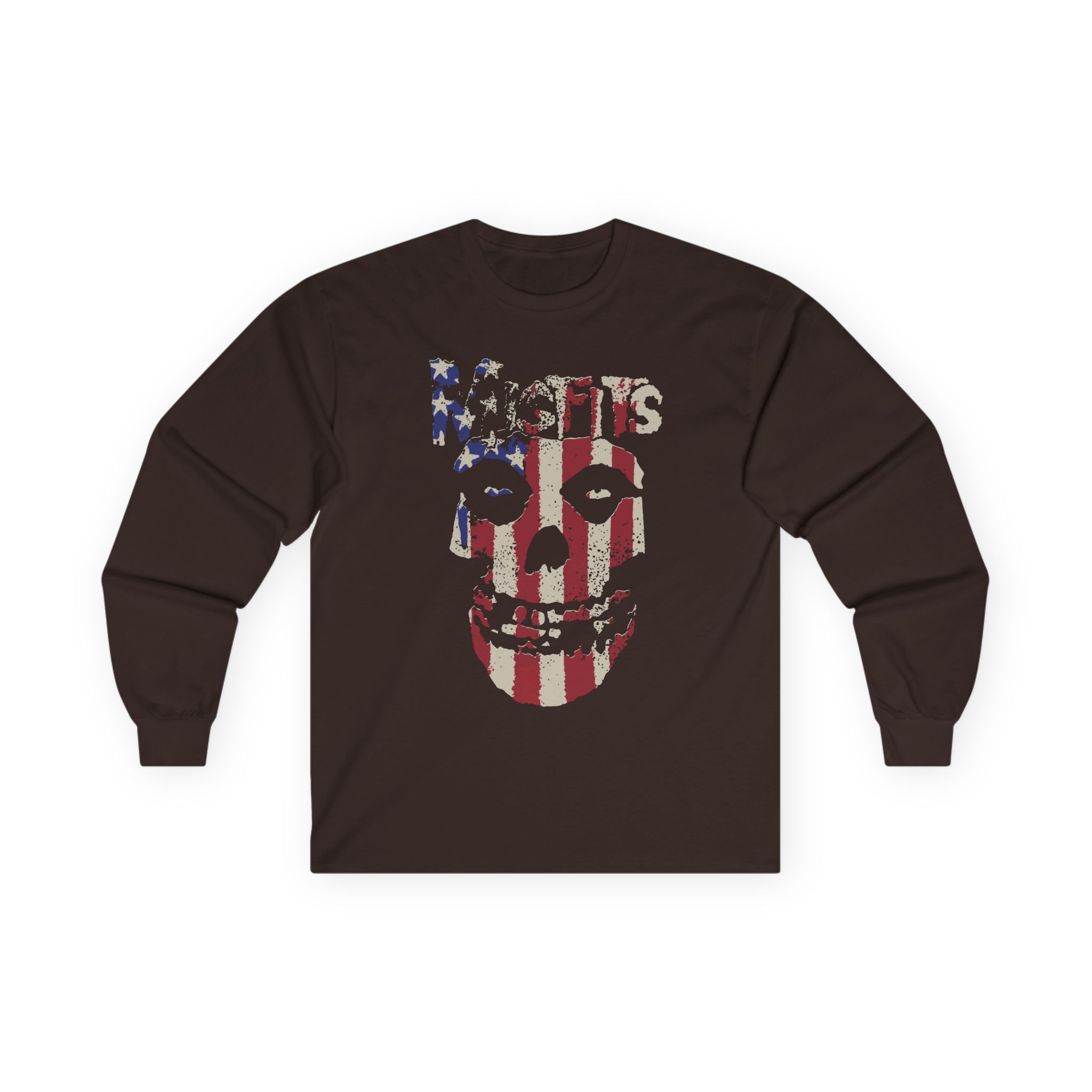 A bit more formal than a standard-issue t-shirt, the Misfits Stars and Stripes Fiend Skull ultra cotton long sleeve tee is a clear comfort winner. The sleeves also act as a nice frame. There are no side seams. The shoulders are taped for improved durability. This makes for a good fitting around the shoulders and neck. The cotton used for these shirts is environmentally friendly.
