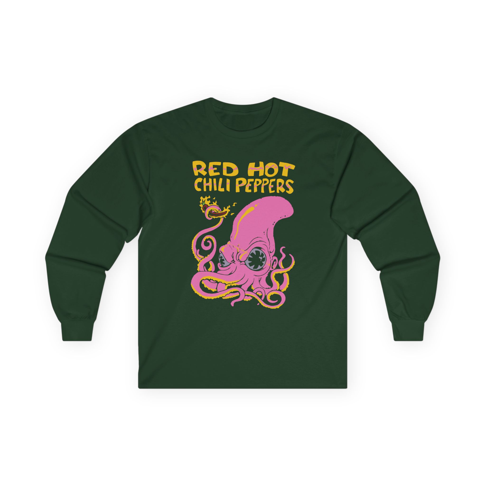 A bit more formal than a standard-issue t-shirt, the Red Hot Chili Peppers Octopus ultra cotton long sleeve tee is a clear comfort winner. The sleeves also act as a nice frame. There are no side seams. The shoulders are taped for improved durability. This makes for a good fitting around the shoulders and neck. The cotton used for these shirts is environmentally friendly.