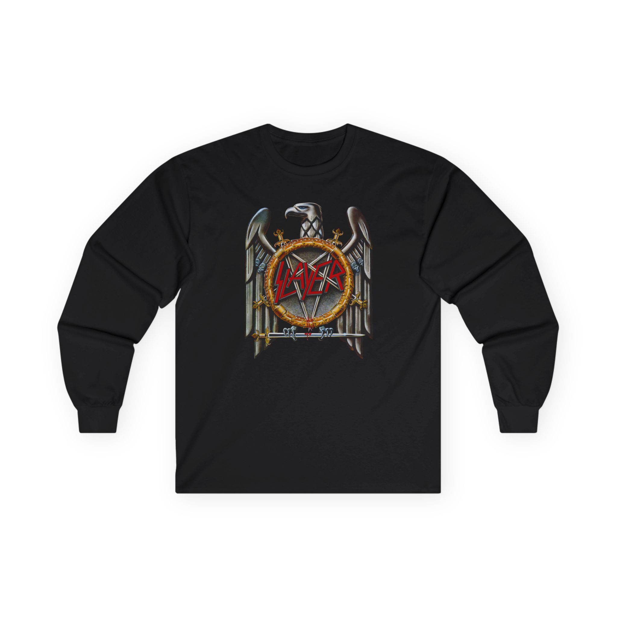 A bit more formal than a standard-issue t-shirt, the Slayer Silver Eagle ultra cotton long sleeve tee is a clear comfort winner. The sleeves also act as a nice frame. There are no side seams. The shoulders are taped for improved durability. This makes for a good fitting around the shoulders and neck. The cotton used for these shirts is environmentally friendly.