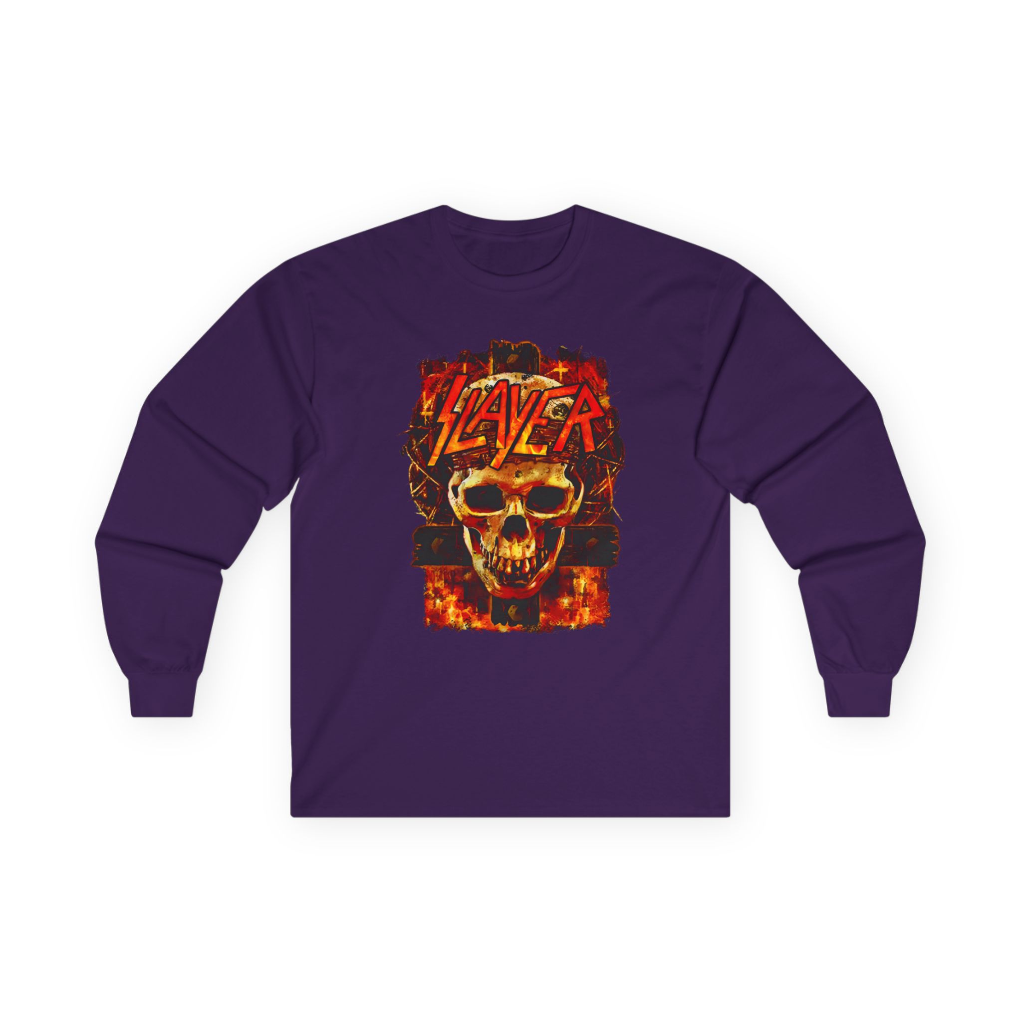A bit more formal than a standard-issue t-shirt, the Slayer Skull And Cross ultra cotton long sleeve tee is a clear comfort winner. The sleeves also act as a nice frame. There are no side seams. The shoulders are taped for improved durability. This makes for a good fitting around the shoulders and neck. The cotton used for these shirts is environmentally friendly.