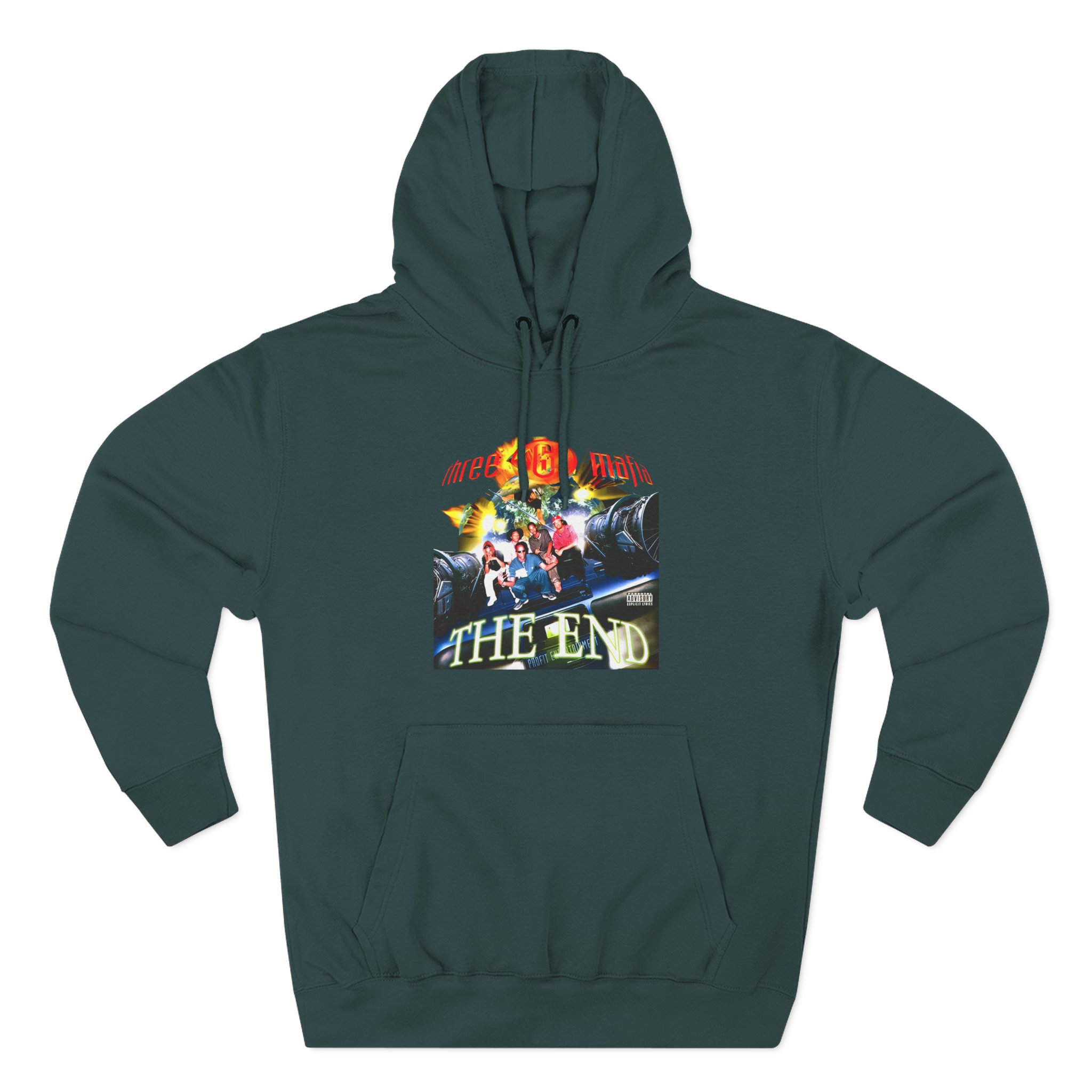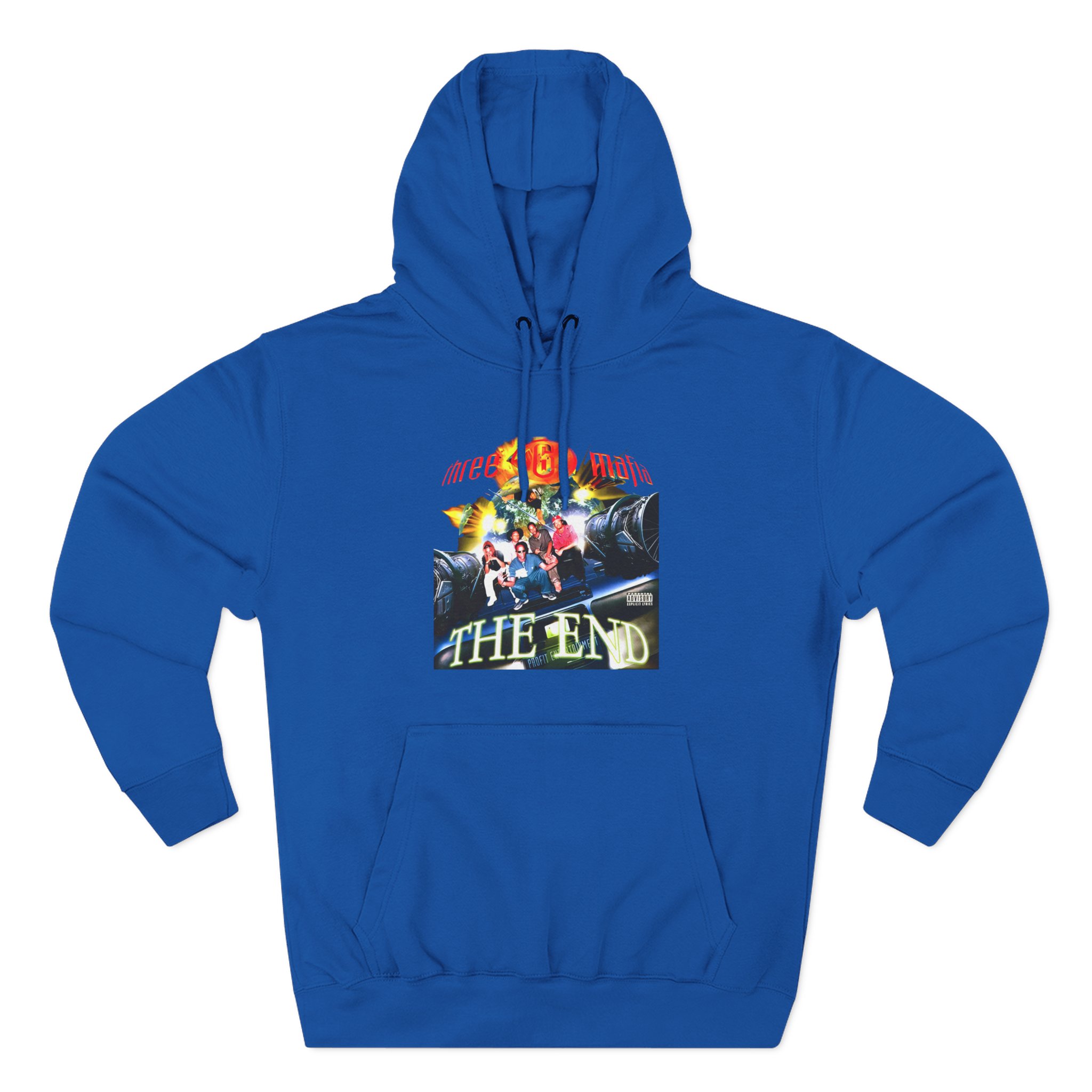 Beat the cold with this Three 6 Mafia the End premium pullover hoodie that’s just the right layer of warm and cozy. Made with three-panel fleece lining, this pullover is double stitched for durability and roomy. Pick one in your favorite color to match your style.